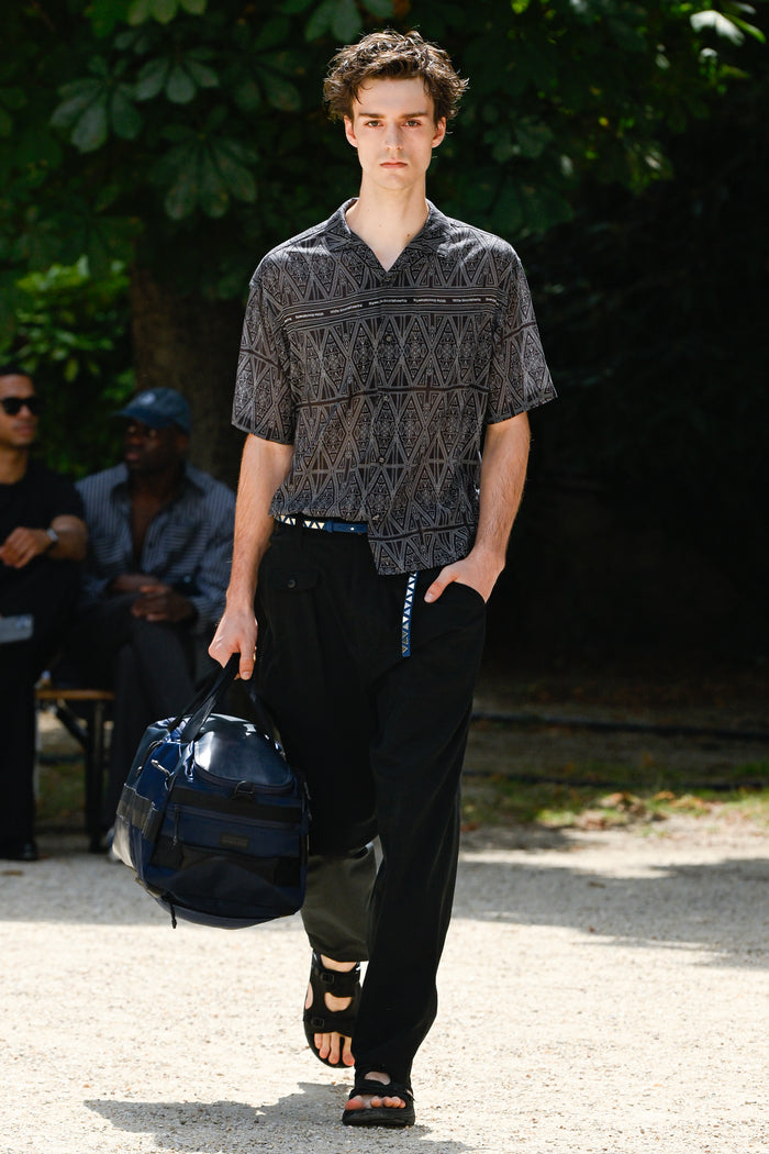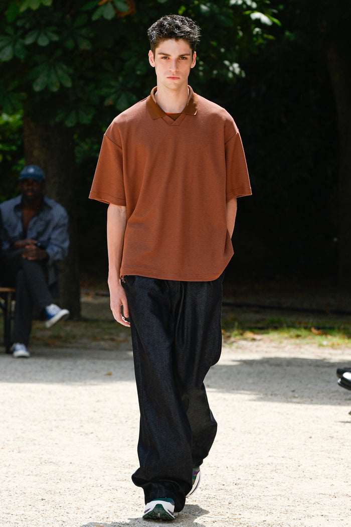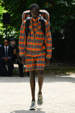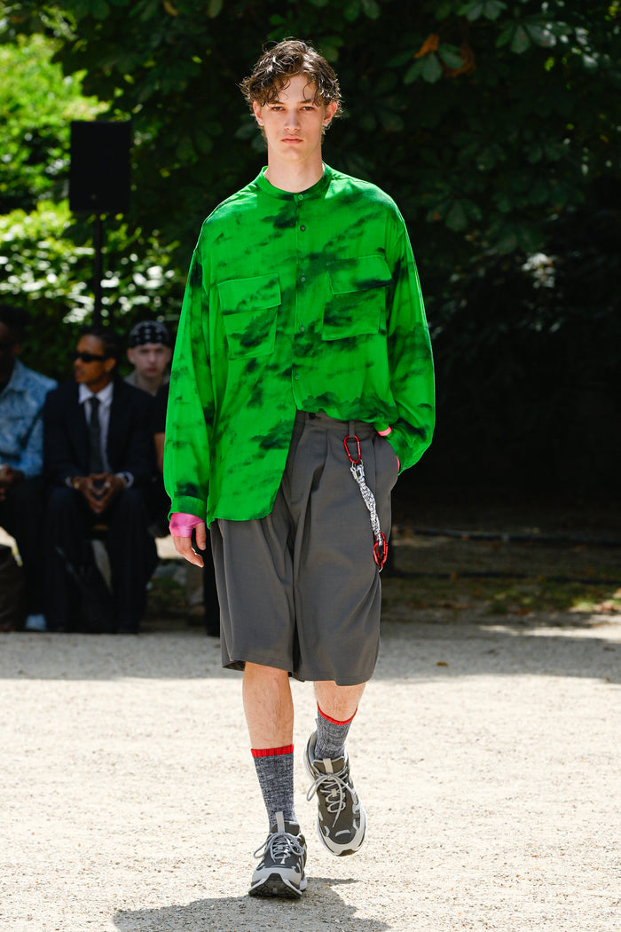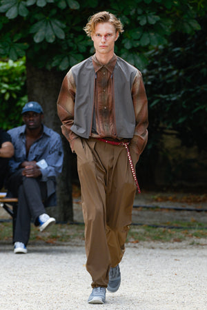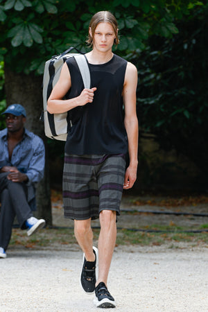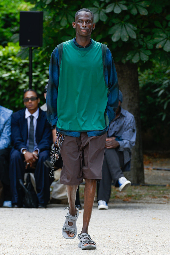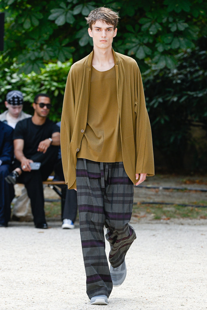 Shirts that look like normal cotton madras checks, ombre checks, or stripes are replaced with polyester mesh or gauze, which are light, quick-drying, and stretchy materials. For the knitwear, various mesh fabrics were digitized to create a seamless, lightweight, and lean design.